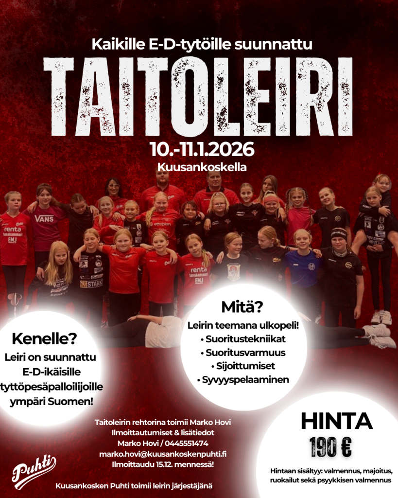 Ulkopeliin keskittyvä taitoleiri E-D-ikäisille järjestetään 10.-11.1.2026. Tervetuloa mukaan!